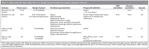 Adam ve arkadaşlarının 96'sı k???k h?creli dışı akciğer kanseri (KHDAK), 18'i k???k h?creli akciğer kanseri (KHAK) ve biri mezotelyoma olmak ?zere toplam 139 hastayı inceledikleri ?alışmada YB? prognozunu ?ng?rmede APACHE III ve SAPS III incelenmiştir. MV uygulanması, kan k?lt?r?nde ?reme olması, vazopres?r kullanımı, y?ksek serum laktat d?zeyi, kardiyak destek uygulanması ve iki u? organ yetmezliğinin olması k?t? prognostik fakt?rler olarak tespit edilmiştir. ?ok değişkenli analiz sonucunda mortaliteyi etkileyen en ?nemli fakt?rler olarak vazopres?r kullanımı ve ikiden fazla organ yetmezliği bulunmuştur (10). Roques ve arkadaşları tarafından yapılan bir araştırmada yaş ortalaması 65 olan 87 KHDAK ile 18 KHAK toplam 105 hastanın SAPS II ve ardışık organ yetmezliği değerlendirme skoru (SOFA) değerlendirilmiştir. Bu araştırmada evre IIIB-IV hastalar olguların ?oğunluğunu oluşturmaktaydı. MV uygulanması, performans skoru (PS) > 2 olması ve akut solunum yetmezliği k?t? prognostik fakt?rler arasında yer almıştır. Stabil hastalığı olan ve PS ≤ 2 olan hastaların, YB? sonu?larının daha iyi olduğu bildirilmiştir (22). Ancak ileri evre akciğer kanseri hastaları YB?'ye yatırıldığında hastalıkları stabil olmasına rağmen YB? yatışının, trombozis gibi komplikasyonları tetikleyebileceği unutulmamalıdır. Toffart ve arkadaşları tarafından yapılan ?alışmada PS < 2 ve lojistik organ disfonksiyon (LOD) skoru iyi prognostik belirte?ler olmuştur. YB? yatışının ilk 72 saatinde LOD skorundaki spesifik d?ş?ş k?t? prognozla ilişkili bulunmuştur (23).