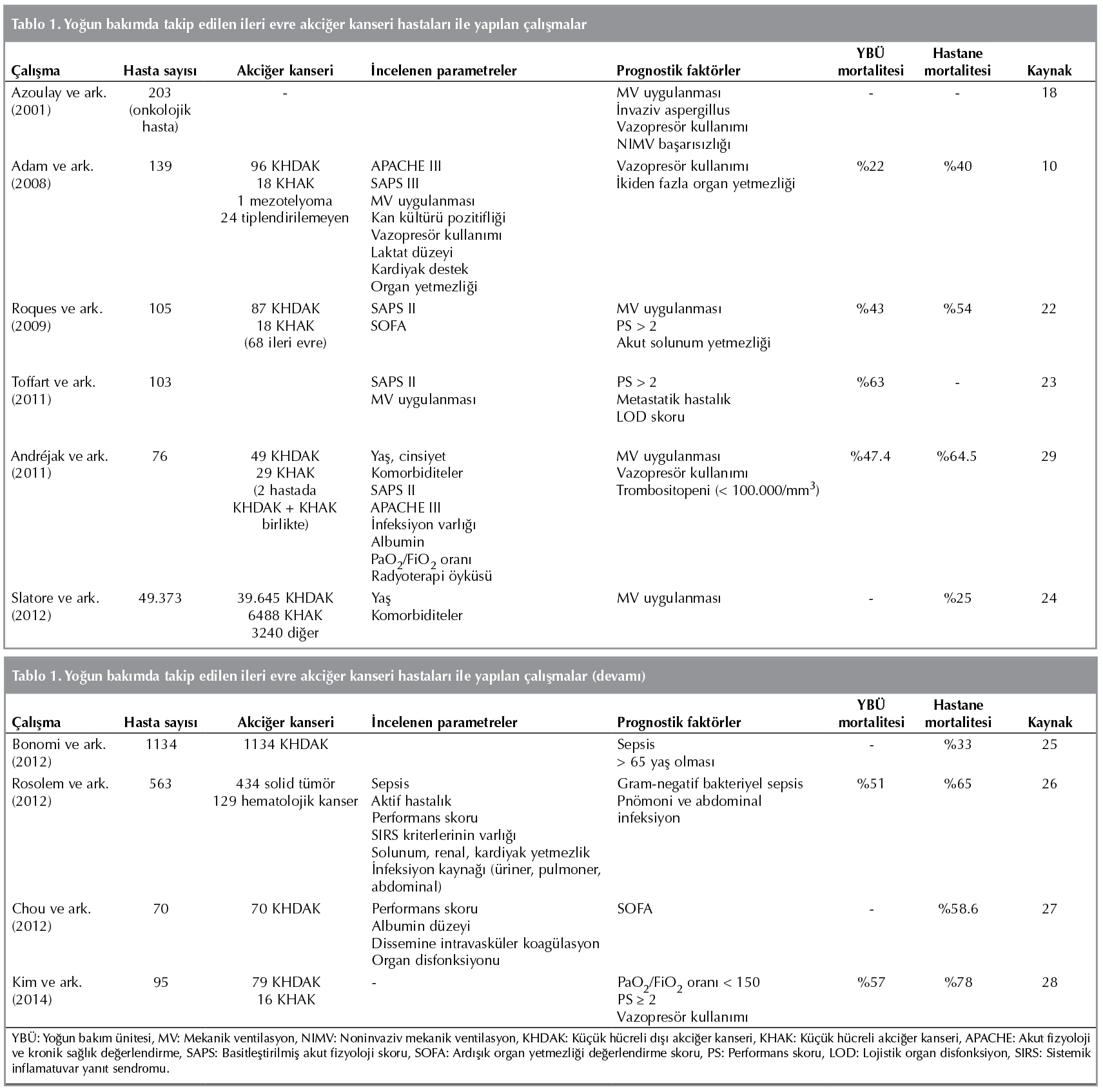 İnfeksiyon, konjestif kalp yetmezliği nedeniyle YB?'ye yatırılan ve k?t?leşme nedeni tespit edilemeyen hastaları da i?eren 203 onkolojik hastanın incelendiği ?alışmada MV ihtiyacının artmış mortalite ile ilişkili olduğu belirtilmiştir. Bu ?alışmada invaziv aspergillus, vazopres?r kullanımı, MV başlanması, NIMV başarısızlığı mortalite ile ilişkili bulunurken pulmoner ?dem nedeniyle ent?be olan hastalarda prognoz en iyi bulunmuştur (18). Daha geniş 49.373 akciğer kanseri hastasının incelendiği seride MV uygulanması YB? sonucunu belirleyen esas fakt?r olarak tespit edilirken MV uygulanan hastaların ?oğu 6 ay i?inde kaybedilmiştir (24). Yaygın evre hastalığı olan (Evre IIIB, IV) > 65 yaş ?st? hastaların alındığı 1134 hastanın incelendiği ?alışmada sepsis ve 65 yaş ?st? olma mortalite ile ilişkili bulunmuştur. Aynı ?alışmada YB? taburculuğu ?ncesi bir?ok defa hastane yatışı gereken hastalarda bir yıllık mortalite %90 olmuştur (25). Yatış ?ncesi gram-negatif bakteriyel sepsis 563 hastanın dahil edildiği başka bir ?alışmada mortalite i?in maj?r belirleyici bulunmuştur (26). Chou ve arkadaşlarının ?alışmasında sepsis ilişkili solunum yetmezliği bulunan toplam 70 evre III ve IV KHDAK olgusu değerlendirilmiştir. Hastane mortalitesi %58.6 olan bu ?alışmada, sağkalan hastaların sadece %44.8'i MV'den ayrılabilmiştir. ?len hastaların YB? kabul?nde performans skorlarının ve albumin d?zeylerinin d?ş?k, disemine intravask?ler koag?lasyon sıklığının ve ciddi organ yetmezliğinin daha fazla olduğu, SOFA skorlarının daha y?ksek olduğu tespit edilmiştir. ?oklu değişkenli analiz sonucunda SOFA skoru mortalite i?in bağımsız risk fakt?r? olarak bulunmuştur. Aynı araştırmada ileri evre KHDAK hastalarının YB?'ye kabulde SOFA skorları y?ksek ise palyatif bakıma y?nlendirilmeleri ?nerilmiştir (27). Kim ve arkadaşları hastaların %90'ının MV ihtiyacı olduğu 95 ileri evre hastayı (79 KHDAK, 16 KHAK) inceledikleri ?alışmalarında, PaO2/FİO2 < 150 olmasının YB? mortalitesi i?in bağımsız risk fakt?r? olduğunu belirtirken; ECOG PS < 2 ve vazopres?r kullanımını hastane mortalitesi i?in bağımsız risk fakt?rleri olarak bulmuşlardır. Hastaneden taburcu edilebilen hastaların %52'si (11 hasta) kemoterapi alabilmiştir. YB?'ye kabulde ileri evre akciğer kanseri hastalarının ECOG PS > 2 ise yine palyatif bakım a?ısından değerlendirilmelerini ?nermişlerdir (28). Dahili YB?'ye alınan 76 akciğer kanseri [49 KHDAK (Evre IIIB: 20, Evre IV: 29), 27 KHAK] hastasının incelendiği ?alışmada, hastaların %39.5'i kanser tedavisine bağlı komplikasyonlar, %18.5'i kanser progresyonu, %22'si kanserin ind?klediği rahatsızlık nedeniyle YB?'ye alınmıştır. Hastaların %75'inin MV ihtiyacı olduğu bu ?alışmada hastane mortalitesi %47.4 bulunmuştur. Trombositopeni, vazopres?r kullanımı ve MV ihtiyacı mortalite i?in bağımsız ?? risk fakt?r? olarak bulunmuştur. Bu ?alışmada hastaların %35.5'i hastaneden taburcu olduktan sonra kemoterapi almıştır (29) (Tablo 1).