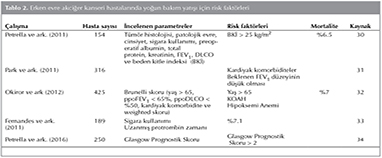 Erken evre akciğer kanserli hastalar tamamen farklı bir hasta grubu olarak değerlendirilmelidir ve YB?'ye kabulde farklı bir yaklaşıma tabii tutulmalıdır. ??nk? erken evre akciğer kanserli hastaların YB? prognozu, ileri evre akciğer kanserli hastalardan daha iyi olmaktadır. Bu hastalar ?oğunlukla postoperatif komplikasyonlar nedeniyle YB?'ye alınmaktadırlar. Bu noktada operasyon sonrası komplikasyon gelişebilecek hastaların farkında olunması ve erken YB?'ye alınması ?nemlidir. Petrella ve arkadaşlarının cerrahi olarak rezeke edilen hastalarda postoperatif komplikasyonları inceledikleri ?alışmasında hastaların t?m?r histolojisi, patolojik evresi, cinsiyeti, sigara kullanımı, preoperatif albumin, total protein, kreatinin, FEV1, DLCO d?zeyleri değerlendirilmiştir. Beden kitle indeksi (BKİ) i?in sınır değer 25 kg/m2 alınmış ve BKİ > 25 kg/m2 olan hastalarda kreatinin değerlerinin, postoperatif pulmoner komplikasyonların 5.3 kat arttığı ve obez hastaların rezeksiyon sonrası pulmoner komplikasyonlar a?ısından dikkatli takip edilmesi gerektiği vurgulanmıştır (30). Park ve arkadaşları d?ş?k riskle lobektomi yapılan hastaların postoperatif erken d?nemde YB?'ye alınmasının, hastaların erken ve ge? komplikasyonları ile mortalite a?ısından fark yaratıp yaratmadığını incelemişlerdir. Toplam 425 hastayı inceledikleri ?alışmalarında kardiyak komorbiditelerin ve postoperatif beklenen FEV1 d?zeyinin d?ş?k olmasının erken komplikasyonlar a?ısından risk fakt?r? olduğunu ancak lobektomi yapılan d?ş?k riskli hastaların erken d?nemde YB?'de izlenmesinin komplikasyonları ve mortaliteyi azaltmadığını, y?ksek riskli hastaların YB?'ye alınması gerektiğini belirtmişlerdir (31). Okiror ve arkadaşları rezeksiyon yapılan hastalarda acil ve plansız YB? kabul? i?in risk tahmini yapan bir model oluşturmaya ?alışmışlardır. Maj?r rezeksiyon yapılan 425 KHDAK hastası ile yaptıkları ?alışmada hastaların %18'i YB?'ye yatırılmış ve bu hastaların %7'sinde mortalite g?r?lm?şt?r. Solunum fonksiyonları YB? prognozunu etkileyen bir fakt?r olarak bulunmamıştır. Brunelli skorunun (yaş > 65 , ppoFEV1 < %65, ppoDLCO < %50, kardiyak komorbidite ve ağırlaştırılmış skor ile hesaplanan bir skorlamadır) YB? yatışını ?ng?rmede kullanılabileceğini ?nermişlerdir (32). Fernandes ve arkadaşlarının 189 hastayı inceledikleri ?alışmalarında anemi, > 65 yaş ?st? olma, hipoksemi ve KOAH postoperatif komplikasyonlar i?in risk fakt?r? olarak tespit edilmiştir (33). Petrella ve arkadaşları da KHDAK nedeniyle pn?monektomi yapılan, uzun s?re YB?'de kalan hastalarda preoperatif Glasgow Prognostik Skoru (GPS)'nu değerlendirmişlerdir. GPS, albumin ve C-reaktif protein değerlerinin ele alındığı bir skorlamadır. GPS 0-1 olan hastaların YB?'de yatış s?releri GPS 2 olan hastalara g?re anlamlı derecede daha kısa (0.8 g?n vs. 5 g?n, p= 0.004), GPS 2 olan hastaların postoperatif YB? mortalite oranları daha y?ksek bulunmuştur. Pn?monektomi yapılacak KHDAK hastalarında GPS'nin 2 olmasının uzun YB? yatışının ?ng?r?lmesi i?in kullanılabileceği vurgulanmıştır (34) (Tablo 2).