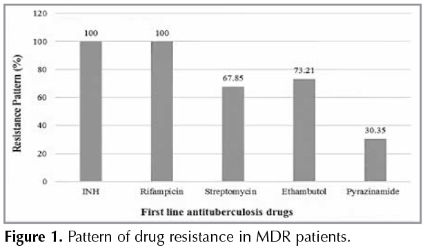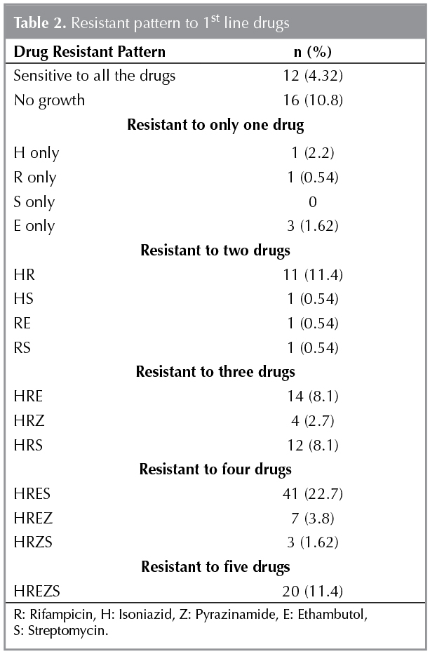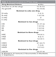 Materials and Methods: The study was conducted during 2013-2016 in which 148 patients were enrolled infected with pulmonary TB. Three sputum samples were consecutively collected and transported for drug analysis to the Provincial Reference Laboratory (PRL) at Hayatabad Medical complex Peshawar (HMCP) TB laboratory, within three days of collection at +4?C in a cold box. Using the standard proportion method, drug susceptibility test was performed on 132 (89.2%) sputum samples for rifampicin (R), isoniazid (H), pyrazinamide (Z), ethambutol (E), and streptomycin (S).