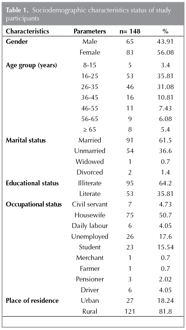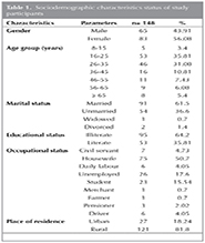 Sociodemographic characteristics of the entire patients are presented in Table 1. A total of 148 sputum samples were collected from new pulmonary tuberculosis patients. Comprised of 65 (44%) were male while 83 (56%) were females, of whom 91 (61.5%) were married, having the literacy rate 95 (64.2%). One twenty-one (81.8%) of these patients belonging to the rural area while most of these patients were house wives 75 (50.7%). The mean age of patients was 32.47 (SD + 15.99).