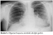 Elli altı yaşında erkek hasta; bir aydır olan nefes darlığı, 15 g?nd?r olan ?ks?r?k ve sarı renkli balgam, iki g?nd?r olan ateş ve miyalji şikayetiyle başvurdu. ?z ge?mişinde hipertansiyon, diyabet, 15 yıldır ankilozan spondilit (AS) ?yk?s? mevcuttu. Hastanın infliksimab 400 mg 4 yıl boyunca iki ayda bir kullanma ?yk?s? mevcuttu. İnfliksimab yanıtsızlık nedeniyle 50 mg/hafta etanersept kullanımına ge?ilmiş, 10 ay s?reyle tedavi g?rmekteydi. 2011 yılında t?berk?lin cilt testi 23 mm bulunması sonucu 9 ay s?reyle INH profilaksisi almıştı. Fizik muayenede; genel durumu orta, bilinci a?ık, koopere ve oryante idi. Solunum sistemi muayenesinde solunum seslerinda sağ bazal raller? mevcuttu. Diğer sistem muayeneleri doğaldı. Periferik sat?rasyonu %92 idi, solunum sayısı 30/dk idi. Postero-anterior akciğer grafisinde; sağ sin?s k?nt, sağ diyafragma ?st?nde diyafragmadan perifere uzanan atelektazi ile uyumlu lineer opasite, sol plevral ef?zyon, sol orta bazal parakardiyak opasite mevcuttu (Resim 1).