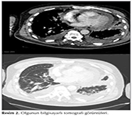 Laboratuvar testlerinde; sedimentasyon 64 mm/saat, CRP: 19 mg/dL, D-dimer 3.42 ?mg/mL; arter kan gazında; pH: 7.48, PaO2: 55 mmHg, PaCO2: 34 mmHg, HCO3: 26 mmol/L, SaO2: %89 idi. Pulmoner emboli protokol?nde toraks tomografisinde; pulmoner emboli saptanmadı perikardda en kalın yerinde 22 mm ulaşan ef?zyon her iki hemitoraksta plevral ef?zyon ve komşu akciğer parankiminde kompresif atelektazi saptandı (Resim 2).