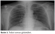 Diğer nedenler dışlandıktan sonra hastada anti-TNF'ye bağlı lupus nedeniyle gelişen pl?rezi d?ş?n?ld?. ?? g?n 100 mg prednol uygulandı. Prednol azaltılarak kesildi. Hastanın tedavisine metotreksat ile devam edildi. Prednol sonrası postero-anterior akciğer grafisi tamamen d?zeldi (Resim 3).