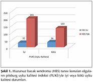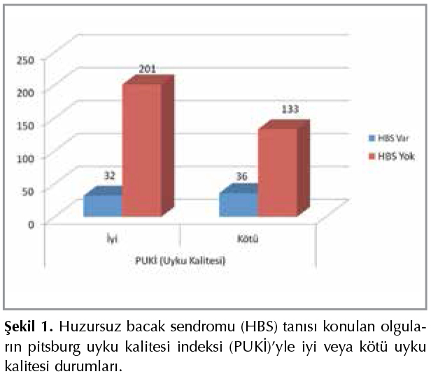HBS ?zellikle geceleri ve immobilite periyotları sırasında bacaklarda huzursuzluk ve dizesteziyle karakterize bir sensori-motor bozukluktur (11). Bu hisler ve bacakları hareket ettirme ihtiyacı genelde uykuya dalma ve uykunun idamesini zorlaştırır. HBS'de uykuya dalma s?resinin uzadığı, uyku kalitesinin ve uykunun idamesinin bozulduğu ve bunun HBS'ye bağlı sensorimotor duyular ve bacakları hareket ettirme d?rt?s?ne bağlı oluştuğu d?ş?n?lmektedir (15). Uyku kalitesinin PUKİ ile değerlendirdiğimiz ?alışmamızda HBS tanısı konan olgularda, HBS olmayan olgularla karşılaştırıldığında anlamlı derecede uyku kalitesinin bozulduğu saptandı. HBSŞD? ile PUKİ puanları karşılaştırıldığında fark saptanmadı (p= 0.328).