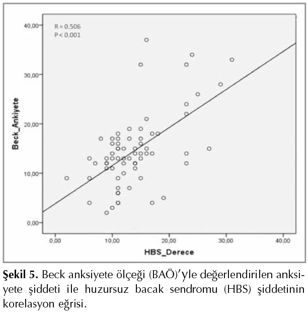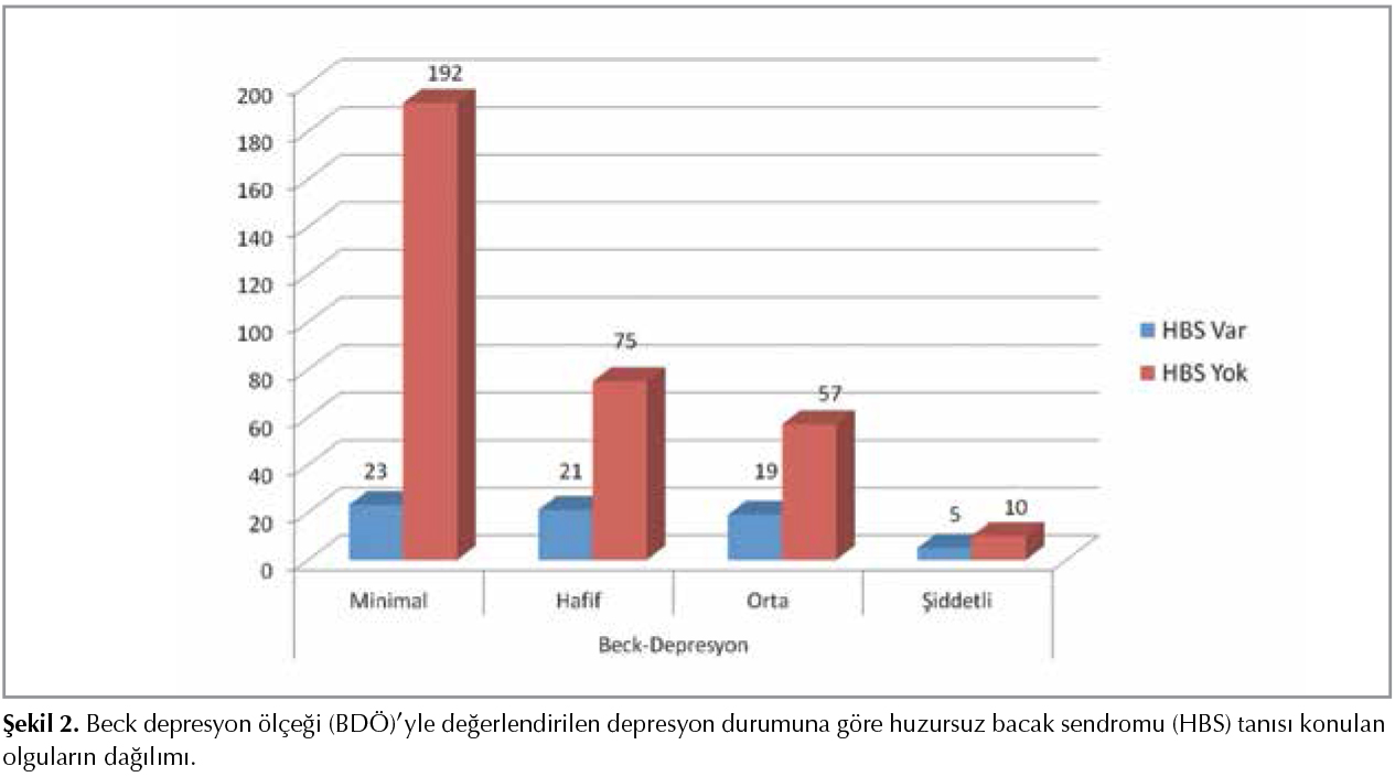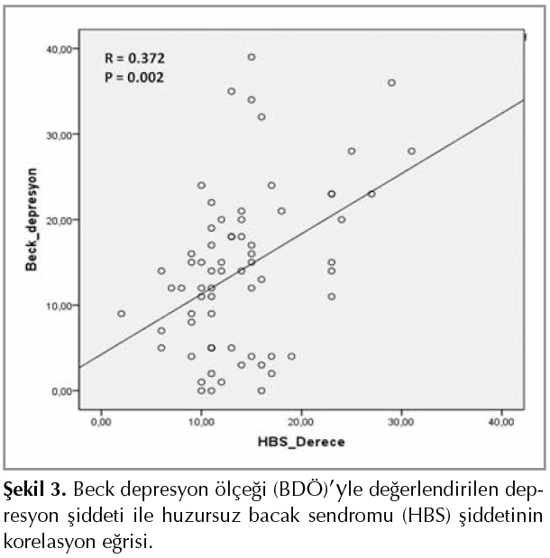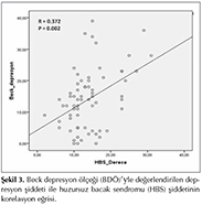 ?zellikle HBS tanılı hastalarda depresyon sıklığı %10-50 arasında değişmektedir (19). Hornak ve arkadaşlarının yaptığı bir ?alışmada HBS tanısı olan olgularda genel pop?lasyonla karşılaştırıldığında depresyon oranında artış olduğu bulunmuştur (20). Maj?r depresyon bozukluğu yaşam boyu prevalansı HBS olan hastalarında %36.9'ken, sağlıklı kontrol grubunda %15.2 olarak tespit edilmiştir [OR= 2.9 (%95 g?ven aralığı (GA) 1.5-4.4)]. Winklemann ve arkadaşları HBS ve depresyon arasında karmaşık bir ilişki olduğunu belirtmiştir (21). Li ve arkadaşları ?zellikle 56.399 depresyon bulgusu olmayan kadın hastanın 6 yıllık takibi sonucunda altta yatan HBS tanısı varlığında olmayanlara g?re klinik olarak depresyona eğilimin daha sık ortaya ?ıktığını bildirmiştir (r?latif risk (RR)= 1.5, 95% GA: 1.1-2.1; p= 0.02) (22). Hem HBS hem de depresyon hastaları arasında semptomların ?rt?şmesi nedeniyle tanı karmaşıklığına neden olmaktadır. HBS hastalarında g?r?len uyku bozuklukları, duygu durum rahatsızlıkları, ajitasyon ve konsantrasyonda azalma olması depresyonla karıştırılabilir. ?zellikle HBS konusunda tecr?besi veya bilgisi olmayan klinisyenler tarafından eşlik eden depresyon semptomları nedeniyle bu hastalara yanlış tanılar konulabilmektedir (23). ?alışmamızda HBS olan olgular HBS olmayan olgularla karşılaştırıldığında BD? puanlarının daha y?ksek olduğu bulunmuştur. HBS saptanan olgularda HBS şiddet değerlendirme ?l?eğiyle BD? puanları arasında pozitif korelasyon bulunmuştur. Bu da HBS tanılı hastalarda HBS şiddeti arttık?a depresyon bulgularının da arttığını g?stermektedir.