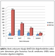Olguların BA? toplam puanı ortalama 10.06 ? 6.21'di. (0-57 puan). HBS bulguları var olan 68 olgunun BA? şiddetine g?re 11 (%16.17)'inde minimal d?zeyde anksiyotik belirtiler, 34 (%50)'?nde orta d?zeyde anksiyotik belirtiler, 16 (%23.52)'sında orta d?zeyde anksiyotik belirtiler, 7 (%10.29)'sinde şiddetli d?zeyde anksiyotik belirtiler olduğu g?r?ld? (Şekil 4).