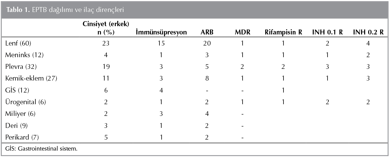 ?alışmanın yapıldığı d?nemde 165 (75 erkek), yaş ortalaması: 53.35 ? 19.92 (min: 2, max: 92) hastadan 171 ?rnekte M. tuberculosis ?remesi saptanmıştır. Kırk d?rt hastada direkt mikroskopik incelemede asido rezistan basil g?r?lm?şt?r. En yaygın EPTB formu 60 hastada (%36.3) lenf nodu, 32 hastada (%19.3) plevral t?berk?loz ve 25 hastada (%15.1) kemik t?berk?lozuydu (Tablo 1). Altı hastada birden fazla organ tutulumu vardı. Hastaların ikisinde akciğer birinde deri t?berk?lozu olmak ?zere ?? hastada ge?irilmiş t?berk?loz ?yk?s? bulunmaktaydı. Hastaların 44'?nde altta yatan imm?ns?presyon tespit edildi. Sırasıyla 11 hastada diyabet, 10 hastada kronik b?brek yetmezliği, 8 hastada imm?ns?presif tedavi alan romatolojik hastalık, 8 hastada hematolojik malignite, 7 hastada solid organ malignitesi, 7 hasta insan imm?n yetmezlik vir?s?yle infekte ve 4 hastada b?brek nakli ?yk?s? bulunmaktaydı. K?lt?rde ?reme saptanan 171 ?rneğin 21'inde ila? direnci tespit edildi. Yedi ?rnekte rifampisin, 11 ?rnekte y?ksek d?zeyde izoniazid ve 6 ?rnekte rifampisin ve izoniazid direnci (ila? direnci ?oğalması) g?sterilmiştir.