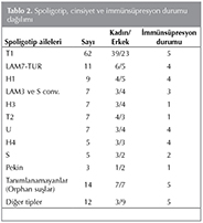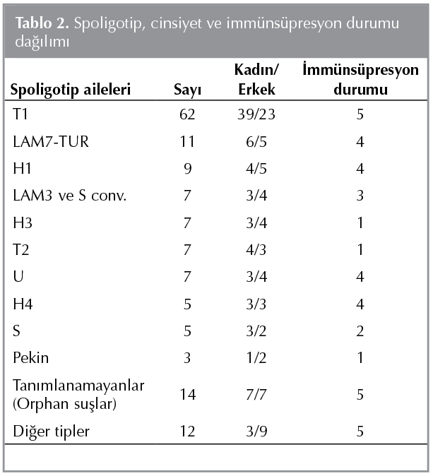 Y?z kırk dokuz klinik ?rnekte genetik profili Spoligotyping kullanılarak belirlenmiştir. Maj?r Spoligotipler T (n= 62, %45.9), Lam7Tur (n= 11, %8.1) ve H1 (n= 7,? 6.6%) genotipleridir. T spolipotipi saptanan 62 hastanın 39'u kadındır. En ?ok g?r?len tipler ve cinsiyet dağılımları Tablo 2'de verilmiştir.