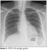 Tanının ikinci aşaması g?r?nt?lemedir. En basit g?r?nt?leme y?ntemi PA akciğer grafisidir (Resim 1). PA akciğer grafisi genelde normal saptanmakla birlikte, trakea l?menine ait hiperl?sen alanda d?zensizlik g?r?lebilir (Resim 2).