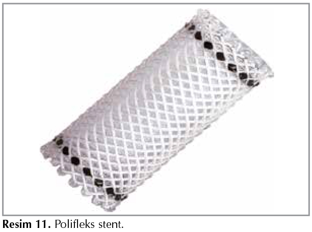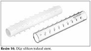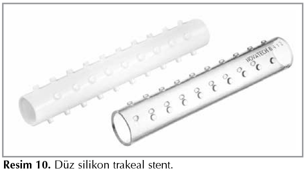Stentler: Cerrahiyi kabul etmeyen ya da inoperabl olgularda hem palyasyon, hem k?r, hem de bazı hastalarda cerrahiye kadar ge?ecek zamanda hastaya zaman kazandırmak ama?lı, hava yolunda a?ıklık sağlamak ve hava yoluna destek ama?lı kullanılan ara?lardır. Hızlı etkili bir tedavi y?ntemidir. Metal ve silikon olmak ?zere iki ?eşit stent vardır. PETS'ler benign nedenli stenozlar olduğu i?in gereğinde ?ıkarılabileceğinden uygulamada metal stentler değil silikon stentler tercih edilir (Resim 10). Stenozun uzunluğu dikkate alınarak d?z stentler (silikon, polifleks) kullanılabilir (Resim 11).