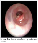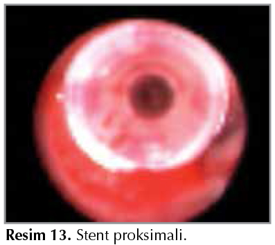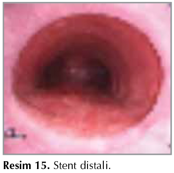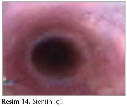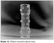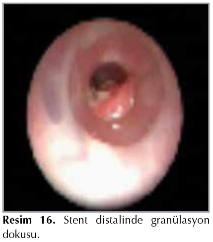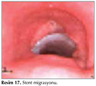 Ge?mişte kullanılan d?z trakeal silikon stentlerde migrasyon sık iken, artık g?n?m?zde kum saati şekilli silikon stenotik stentlerin kullanıma girmesiyle bu risk de olduk?a azalmıştır (36-38) (Şekil 4) (Resim 12,13,14,15,16,17).
