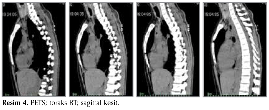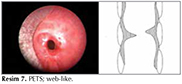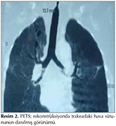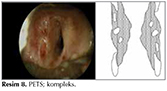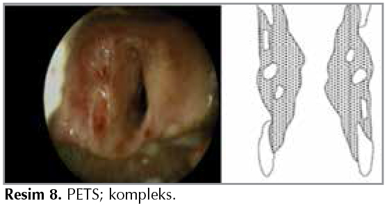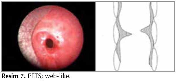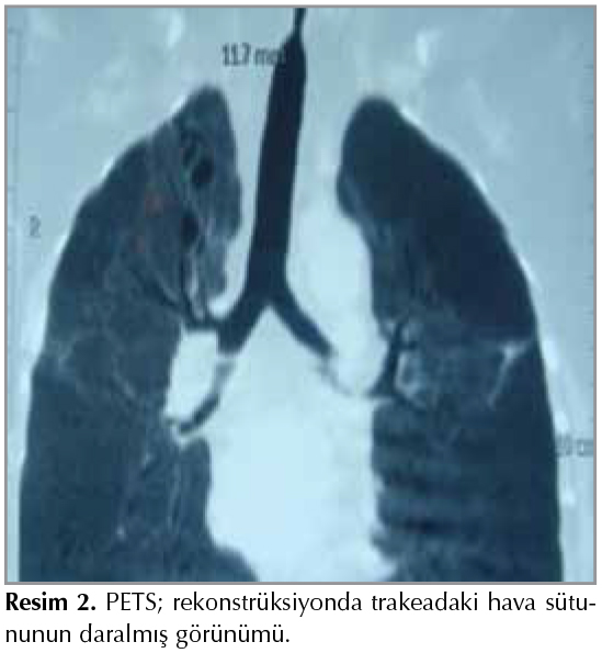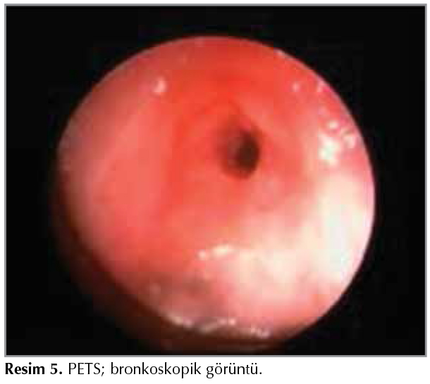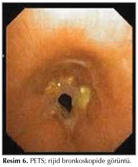 Bronkoskopi PETS'nin tanısında altın standarttır. Fiberoptik bronkoskopi de rijid bronkoskopi de, darlığın yerinin, derecesinin, uzunluğunun ve darlığın tipinin g?r?lmesini sağlar. Mukoza ve eşlik eden diğer patolojiler değerlendirilebilir (Resim 5,6). Fleksibl bronkoskopi tedaviden ziyade, sıklıkla rijid bronkoskopi ?ncesi darlığın değerlendirilmesi amacıyla kullanılmaktadır. Son yıllarda PETS'lerin değerlendirilmesi ve tedavisinde de rijid bronkoskopi kullanımı daha ?ok tercih edilmeye başlanmıştır (19).
