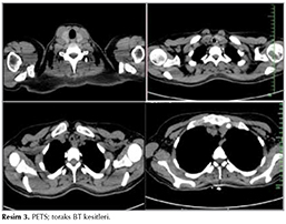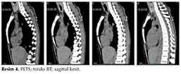 Diğer bir g?r?nt?leme y?ntemi bilgisayarlı tomografidir (Resim 3,4). ?zellikle iki boyutlu kesitler elde edildiğinde trakeayı doğru bir şekilde g?r?nt?lemeye yarayan, noninvaziv bir y?ntemdir. Darlığın lokalizasyonunu, tipini, boyutlarını, damarsal yapılarla ilişkisini, kıkırdak yapının b?t?nl?ğ?n? ve distal hava yollarını ?zellikle de girişimsel işlemler ?ncesi daha iyi değerlendirmeyi sağlar. Sonradan teknik olarak elde edilebilecek "sanal bronkoskopik g?r?nt?ler" de değerlendirmeye katkı sağlayabilir (17).
