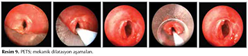 Mekanik dilatasyon: Artan ?apta rijid t?pler kullanılarak yapılan bu dilatasyon y?ntemi hızlı yanıt alınması, kısa s?re i?erisinde yapılabilir olması, tekrarlanabilir olması nedeniyle hayat kurtarıcı ?zelliğiyle de en sık kullanılan, tecr?beli ellerde yapılırsa da olduk?a g?venli olan bir y?ntemdir (Resim 9). Balon kateter ve buji ile darlık b?lgesi dilate edilebilir. Yine web-like stenozlarda kullanılabilen, saat 11 ve 13 hizalarında darlık alanına kesi yapılması da bir diğer tercih edilen y?ntemdir. Mekanik dilatasyon y?ntemlerinin başarı oranı %40-100'd?r. Laserasyon, r?pt?r, pn?motoraks, pn?momedastinum, hemoraji gibi komplikasyonlar g?r?lebilir (30).