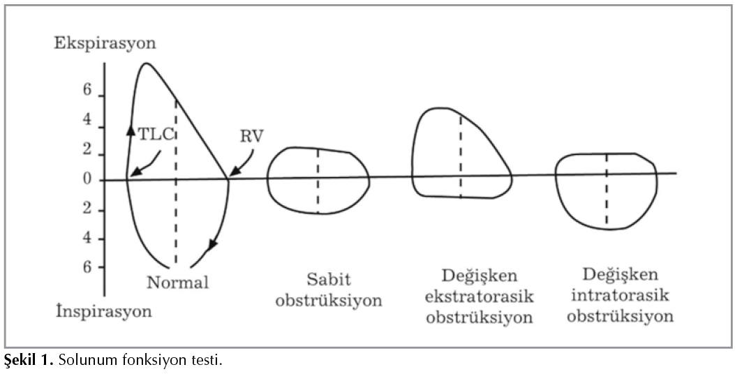 Dispne yakınması olan bir hastada solunum fonksiyon testlerindeki akım vol?m halkası ?oğu zaman olmasa da b?y?k hava yolu obstr?ksiyonunu, derecesini ve darlığın yeri (ekstratorasik ya da intratorasik obstr?ksiyon) hakkında yol g?sterici olabilir (Şekil 1) (18).