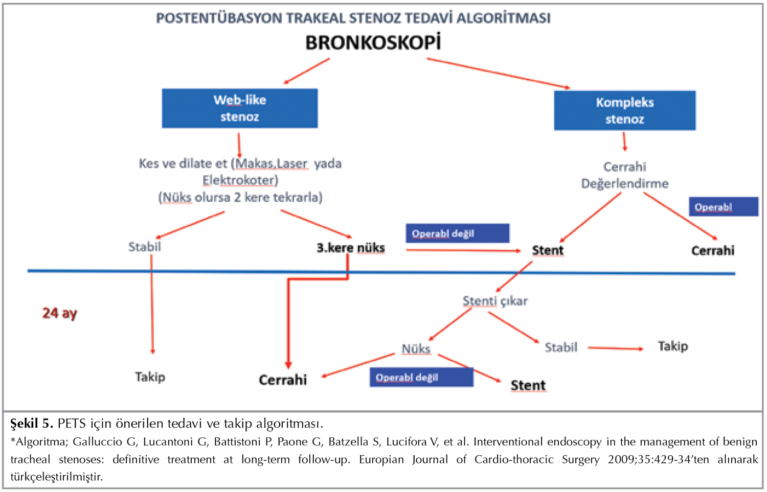 Web-like (basit) PETS'lerde ve kompleks tip PETS'de tedavi ve takip farklıdır. Web-like stenozu olan bir hastada tedavide ilk se?enek girişimsel bronkolojik yaklaşımdır. Darlık alanı artan ?apta rijid t?plerle dilate edilir. Topikal uygulamalarla tedavi kombine edilir. Belirli aralıklarla ve hastanın semptomları gerektirdik?e bronkoskopi, solunum fonksiyon testi ve radyolojik kontrolleri planlanır. Genelde girişimsel işlem sonrası d?nemde 24 aylık bir takip ?nerilir ve bu takip s?resi i?erisinde darlıkta rek?rrens yoksa hasta takipten ?ıkarılır. Ancak tekrarlayan darlık durumunda bronkoskopik dilatasyon ?? kereye kadar tekrarlanır. ??ten fazla dilatasyon gerektiğinde artık hasta kompleks tipte stenoz gibi ele alınarak; cerrahiye uygunluk a?ısından değerlendirilir. Cerrahi olamayacaksa stent yerleştirilir. Kompleks tip stenozlarda ise hasta ?ncelikle cerrahi a?ısından değerlendirilmelidir. Cerrahiye uygun hastalara TRA uygulanır. Cerrahiye uygun olmayan ya da cerrahiyi kabul etmeyen hastalara dilatasyonun ardından stent uygulaması yapılır. İnoperabl hastalar stent ile 24 aya kadar takip edilir. Bu s?re i?erisinde stentin ?ıkarılması denenebilir. Ancak bu deneme ile ilgili belirtilmiş literat?rde net bir s?re olmamasına rağmen 6. ayda uygun s?re olarak belirtilmektedir. Darlıkta n?ks olursa tekrar uygulanabilir. İlk uygulama anında operabl olmayan hastalar, takiplerinde operabl hale gelmeleri durumunda 6 ay-1 yıl sonra stent ?ıkarılmadır. Stent ?ıkarıldığında rek?rrens gelişirse hasta cerrahi a?ıdan tekrar değerlendirilmelidir (Şekil 5) (22,43,44).