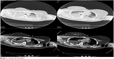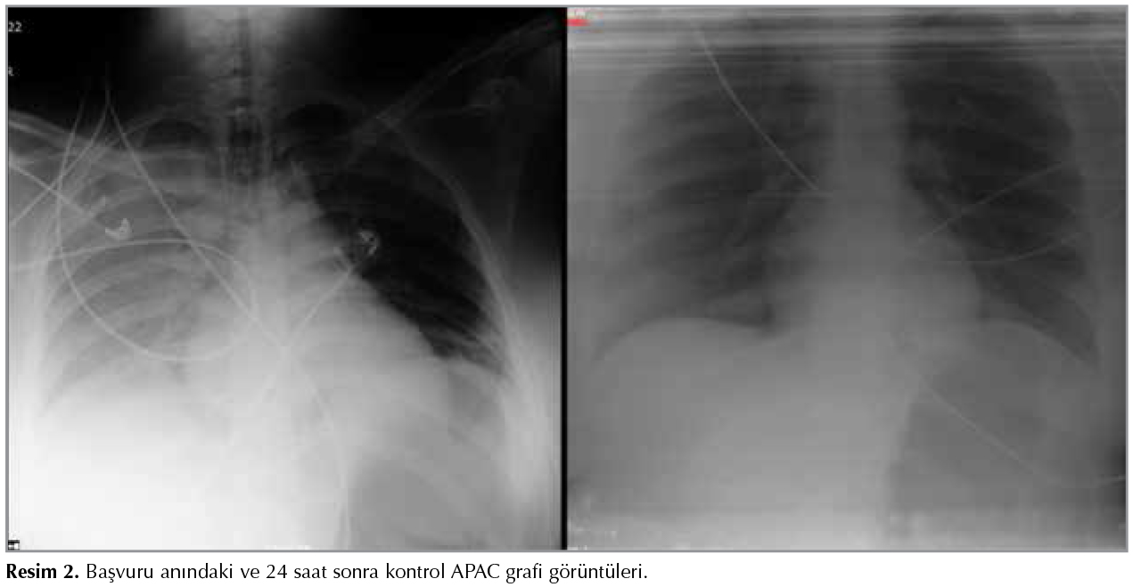 Yirmi altı yaşında kadın hasta, t?pl? şofbenle su ısıtılan (%70 b?tan ve %30 propan karışımı) banyoda 20 dakika ge?irdikten sonra baygın vaziyette bulunmuştur.? Ent?be halde, GKS: 3, pupiller fiks dilateyken ilk bakılan karboksihemoglobin (COHb) %67, kontrol? %33.9 olarak değerlendirilmiştir. Hastanın acil servisimizde bakılan en k?t? kan gazında pH: 7.19, pCO2: 43.5 mmHg, pO2: 490 mmHg, HCO3: 15.4 mEq/L, BE: -11 ve COHb: %27.1 (N: 0.5 2.5) saptanmıştır. K?t? hemodinami, derin koma ve ağır ARDS tablosu nedeniyle (il i?erisinde hiperbarik oksijen tedavisi imkanı yoktur) hastanın hiperbarik oksijen i?in sevki planlanamamıştır. Hasta takibi i?in yoğun bakım ?nitemize devralınmıştır. Genel durumu k?t?, şuuru koma, GKS: 3 olan hastanın santal sinir sistemi değerlendirilmesi i?in ?ekilen BBT'sinde ventrik?ler sistem silinmiş, beyaz-gri cevher ayrımı kaybolmuş ve fiss?rler silinmiş olarak izlenmektedir. ?ekilen Torax BT'sinde her iki akciğer bazal ve posteriorlarda hava bronkogramları g?steren konsolide alanlar ve diğer alanlarda yaygın buzlu cam dansiteleri izlendi (Resim 1). Servisimize ilk kabul?ndeki biyokimyasal değerleri Na: 167 mEq/L, K: 2.7 mEq/L, glukoz: 161 mg/dL, kreatin 0.96 mg/dL, BUN: 9.7 mg/dL, hemoglobin: 8 g/dL, COHb: %20.9, ?l??lm?şt?r. Hipotansif seyreden hastaya (OKB < 65 mmHg) hemodinamik instabilite nedeniyle dopamin inf?zyonu (1 μg/kg/dk) başlanmıştır. Ciddi beyin ?demi nedeniyle mannitol 6x100 mg IV başlandı. Mekanik ventilat?rde airway pressure releasing ventilation (APRV) modda (FiO2: %100, Phigh: 20 cmH20, Plow: 0 cmH20, Thigh: 4 sn, Tlow: 0.8 sn) takip edilen hastada 2 saat sonra oksijenizasyonda belirgin iyileşme, kan gazında d?zelme, COHb'de normalizasyon (COHb: %0.3) ve kontrol APAC grafisinde belirgin d?zelme sağlanmıştır (Resim 2). Bilin? durumunda d?zelme olmayan hastada apne testi, n?rolojik muayene ve BT anjiyoyla beyinde kan akımı olmadığı ve beyin ?l?m? tanısı doğrulanmıştır. Hasta yatışının 2. g?n?nde yakınlarının da onamıyla b?brek ve karaciğer don?r? olmuştur.