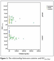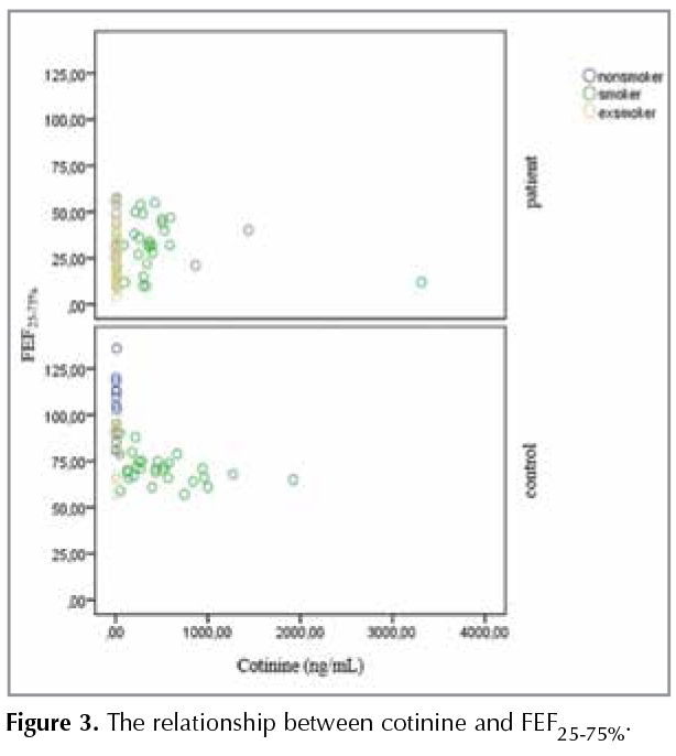 Cotinine levels and spirometric results were compared in both groups. Although there was no relationship in patient groups, a negative correlation was observed between cotinine levels and FEF25-75% in control groups (p= 0.047; r= -0.372).