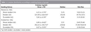 Mean plasma cotinine level was observed 139.61 ng/mL (1.33-3313.13 ng/mL) in patient group and 178.9 ng/mL (0.4-1924.5 ng/mL) in control group. No significant difference was observed in cotinine level between two groups. When two groups are considered together, mean cotinine level was 452.39 ng/mL in smokers and 7.91 ng/mL in non-smokers. Cotinine level was determined by ROC analysis, can be used as a reliable indicator to distinguish smokers and non-smokers according to medical history (p< 0.001). Cut-off value was calculated as 41.12 ng/mL. Cotinine level below 41.12 ng/mL indicates "non-smokers" and above 41.12 ng/mL indicate "smokers". Cotinine cut-off value was detected as 100% specific and 97.2% sensitive. Reliability of smoking history was determined 96.0% in patients and 91.5% in control group.