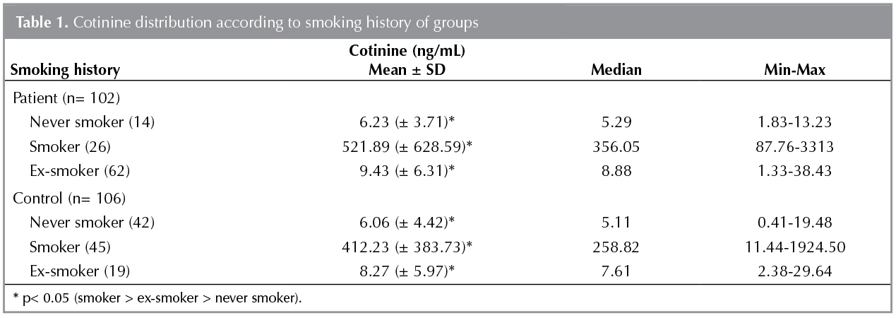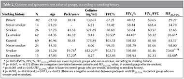 Results: The cut-off value of cotinine was determined as 41.12 ng/mL (97.2% sensitivity and 100% specificity). A significant relationship was observed between average pack-year and cotinine level in current smoker group (p< 0.05). The mean cotinine levels were 6.1, 8.8, and 467.0 ng mL-1 in never smokers, ex-smokers and current smokers, respectively. No relationship was observed between cotinine level and FVC%, FEV1% and FEV1/FVC (p> 0.05). In patient group, there was also no relationship between FEF25-75% and cotinine level however, in control group-smokers a negative correlation was found (p< 0.05; r= -0.372).