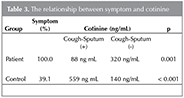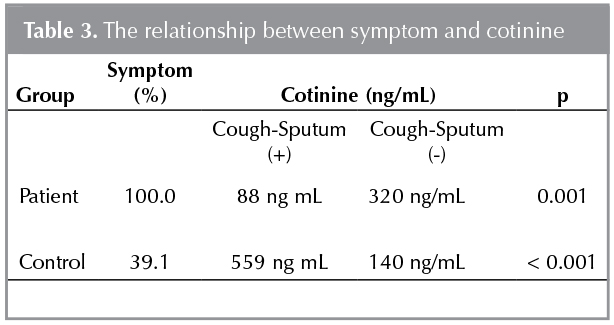 Higher levels of cotinine were correlated with higher incidence of cough and sputum in the control group compared to the patient group (p= 0.001 and p< 0.001) (Table 3).