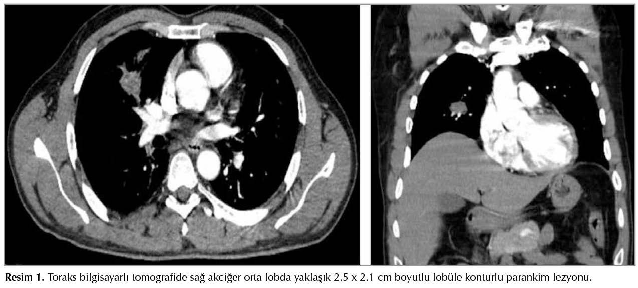 Bilinen bir hastalık ?yk?s? olmayan 49 yaşındaki erkek hasta; ?ks?r?k şikayetiyle başka bir merkeze başvurmuş ve ?ekilen akciğer grafisinde izlenen nod?ler lezyonun ileri tetkiki i?in tarafımıza y?nlendirilmiştir. ?ks?r?k şikayeti devam eden hastanın ?z ve soy ge?mişinde herhangi bir ?zellik saptanmadı. Sigara kullanım ?yk?s? yoktu. Fizik muayenesinde ve laboratuvar tetkiklerinde herhangi bir patolojik ?zellik olmayıp akciğer grafisinde sağ akciğer alt zonda parakardiyak alanda yaklaşık 2-3 cm boyutunda d?zensiz sınırlı opasite izlendi. ?ekilen toraks bilgisayarlı tomografi (BT)'de sağ akciğer orta lobda yaklaşık 2.5 x 2.1 cm boyutlu lob?le konturlu parankim lezyonu izlendi (Resim 1). Yapılan bronkoskopide endobronşiyal lezyon saptanmadı. Patoloji sonucu benign olarak raporlandı. BT eşliğinde transtorasik ince iğne aspirasyon biyopsisi yapılıp patoloji sonucu TTF-1 pozitif, CK5/6 negatif akciğer adenokarsinomu olarak raporlandı.
