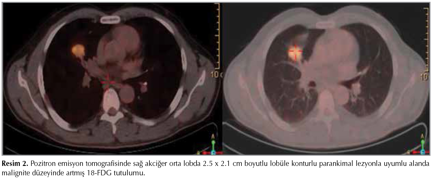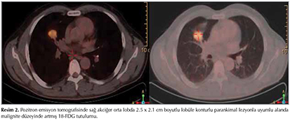 Şiddetli baş ağrısı, baş d?nmesi, dengede bozukluk şikayeti olması ?zerine hasta servisimize yatırıldı. Kontrastlı beyin BT ?ekildi. Metastaz d?ş?nd?ren lezyon saptanmadı. Hastaya a?ık manyetik rezonans g?r?nt?leme (MRG)'de kontrastlı kraniyal MRG ?ekildi. MRG'de de herhangi bir patoloji saptanmadı. Evreleme amacıyla ?ekilen pozitron emisyon tomografisi (PET-BT)'de; sağ akciğer orta lobda 2.5 x 2.1 cm boyutlu lob?le konturlu parankimal lezyonla uyumlu alanda malignite d?zeyinde artmış 18-FDG tutulumu izlendi (Resim 2). Hasta T1bN0M0 olarak değerlendirildi.