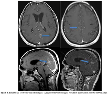 Şiddetli baş ağrısı, denge kaybı şikayetlerine bulantı, fışkırır tarzda kusma ve sağ hemipleji eklenmesi ?zerine hasta n?roloji hekimine kons?lte edildi. Muayenesinde herhangi bir patoloji saptanmadı. Klinik olarak metastaz ş?phesi devam etmesi ?zerine kapalı MRG cihazında kontrastlı kraniyal MRG ?ekildi. Serebral ve serebellar leptomeningeal y?zeylerde LM'yi destekleyen kontrastlanma artışı tespit edildi (T1bN0M1-Evre 4) (Resim 3). Yaş grubuna g?re belirgin ventrik?ler sistem genişlemesi ve ventrik?l ?evresinde de subepandimal beyin omurilik sıvısı (BOS) sızıntısı izlendi. Hasta beyin cerrahisine kons?lte edildi. Acil cerrahi girişim d?ş?n?lmedi. Hastaya anti?dem tedavisi ve kraniyal radyoterapi (RT) başlandı. Hastanın performansı d?ş?k olduğu i?in sistemik kemoterapi (KT) d?ş?n?lmedi. Patoloji preperatlarında ?alışılan mutasyon analizinde EGFR exon 21 L858R mutasyonu saptanan hastaya erlotinib tedavisi başlandı. Hasta tedavinin 3. haftasında olup halen takibimizdedir.