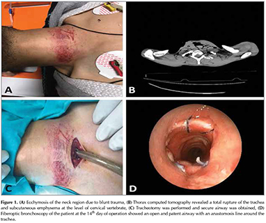 Thirty-two year-old male patient was admitted to the emergency service with complaints of breathlessness and stridor resulting from traffic accident. He was referred to our clinic for suspected rupture of the trachea in the neck region observed on the neck and thorax computed tomography. Physical examination of the patient was as follows; general condition was poor, his consciousness was cloudy and he had had respiratory distress. Approximately 10 cm of ecchymosis was observed on the neck just below the thyroid cartilage (Figure 1A). Arterial oxygen saturation was 88%, pulse rate was 105 bpm, and blood pressure was 95/70 mmHg. Computed tomography of thorax and neck region showed total tracheal rupture immediately below the cricoid cartilage, subcutaneous emphysema, pneumomediastinum and minimal pneumothorax (Figure 1B). The patient, who had severe respiratory distress, was urgently taken to the operating room. Emergency fiberoptic bronchoscopy (FOB) was applied for guidance of intubation and to demonstrate the characteristics of the rupture of the proximal end of the trachea in the operating room FOB revealed a total rupture of the trachea at the 3 cm distal to the vocal cord level. However, distal end of the trachea was not observed properly. Emergency tracheostomy and intubation was performed to obtain secure airway (Figure 1C). Collar's incision was made. At the exposition, it was found that the cervical trachea was totally separated just below the cricoid cartilage similar to the bronchoscopy examination. The trachea was repaired with end to end anastomosis. Perioperative complications were not observed unless hoarseness. Postoperatively, at 14th day, control FOB was performed. Bilateral vocal cord paralysis was observed. The tracheal lumen was open and the anastomosis line was intact (Figure 1D).