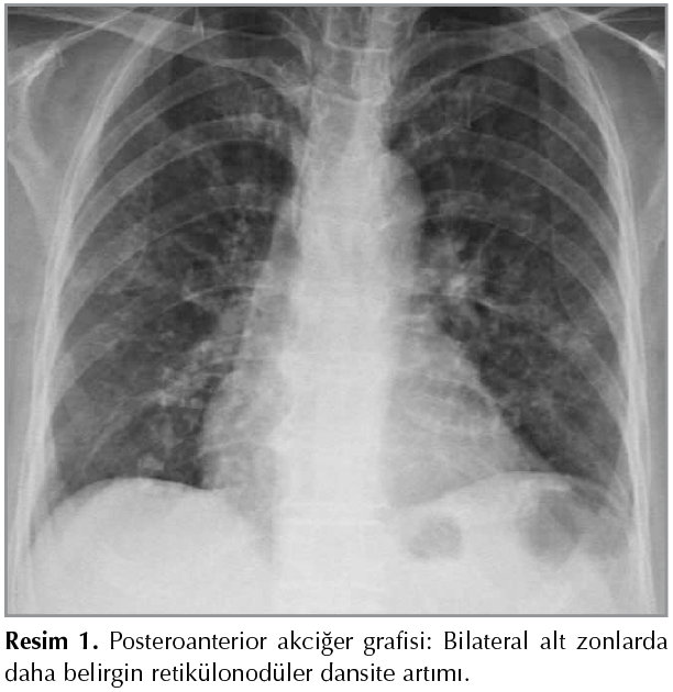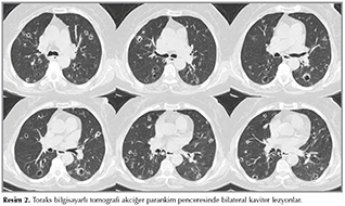 Yetmiş ?? yaşında kadın hasta, ?? haftadır devam eden ?ks?r?k yakınmasıyla polikliniğimize başvurdu. ?z ge?mişinde bir ay ?nce dış merkezde endometriyum adenokarsinomu tanısı mevcuttu. Solunum sistemi bakısı olağan olup vital bulgular ve diğer sistem bakıları da normaldi. Laboratuvar bulgularında hemogram, rutin biyokimya testleri ve CRP normal sınırlarda bulundu. Akciğer grafisinde alt zonlarda daha belirgin retik?lonod?ler dansite artımı mevcuttu (Resim 1). Bu nedenle ?ekilen toraks bilgisayarlı tomografi (BT)'de parankim penceresinde bilateral kaviter lezyonlar izlendi (Resim 2). Fiberoptik bronkoskopide (FOB) endobronşiyal lezyon saptanmadı. FOB ile sağ orta lobtan bronkoalveoler lavaj (BAL) ve fır?a yapıldı. Bronş aspirasyonunda bakteriyel ve mantar k?lt?rlerinde ?reme olmadı, asidorezistan basil (ARB) direkt bakıları negatif sonu?landı. BAL ve fır?a sitolojileri benign olup BAL'da spesifik bulgu saptanmadı. Bakılan ANA, p-ANCA, c-ANCA romatolojik markerları negatif sonu?landı. Tanısal ama?lı BT eşliğinde transtorasik ince iğne aspirasyon biyopsisi (TTİİAB) yapıldı. Hastanın patoloji sonucu "Malign sitoloji; h?cre bloğunda izlenen iğsi n?kleuslu atipik h?crelerde, imm?nhistokimya (İHK) ile pansitokeratin, ?strojen resept?r? (ER), progesteron resept?r? (PR) pozitif; vimentin negatif saptanmıştır. Klinik ?yk? eşliğinde bulgular; endometriyum adenokarsinom metastazı ile uyumludur" olarak raporlandı (Resim 4). Hasta Jinekolojik Onkoloji B?l?m?ne y?nlendirildi. Endometriyum karsinomu ve akciğer metastazı tanıları olan hastaya kemoterapi ?nerildi. Ancak hasta ve yakınları kemoterapiyi kabul etmedikleri i?in semptomatik tedaviyle takip edildi. Olgumuzda tanıdan itibaren 2 yıl ge?miş olup performansı iyi, ?ks?r?k ve bel ağrısı yakınması mevcuttur.