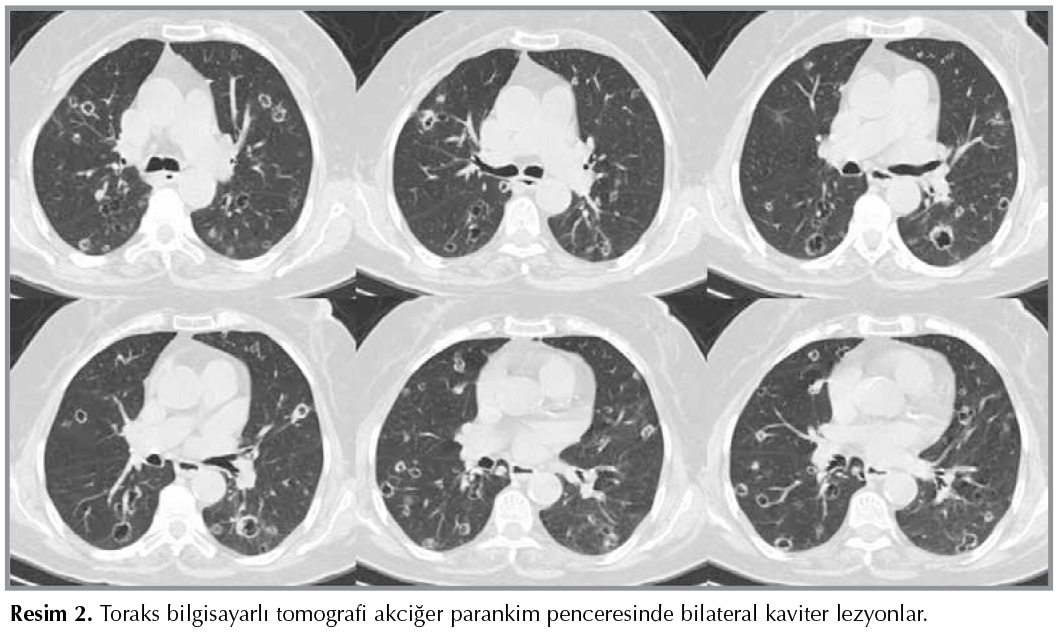 Pulmoner metastazlar radyolojik olarak ?oğunlukla multipl parankimal nod?ller, lenfatik-interstisiyel yayılım ve plevral ef?zyon şeklinde olup, kaviter-kistik metastatik lezyonlar daha nadir g?r?lmektedir. Akciğere ?oğunlukla meme kanseri, akciğer kanseri, gastrointestinal t?m?rler, b?brek t?m?rleri, malign melanom, sarkomlar, lenfoma ve l?semi metastaz yapmaktadır. Endometrial adenokarsinom akciğere nadiren metastaz yapar. Multipl kaviter metastazların nadir g?r?lmesi, endometrial adenokarsinomun akciğer metastazının nadir olması nedeniyle olgumuzu sunmak istedik.
