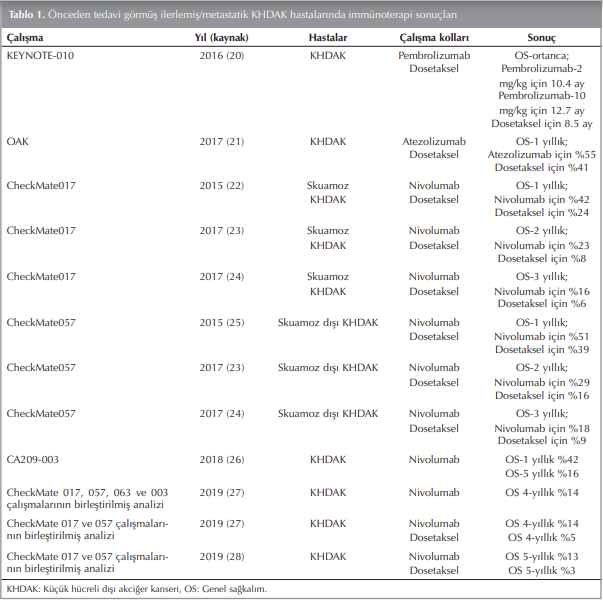 Önceden tedavi görmüş ilerlemiş/metastatik KHDAK hastalarında ikinci/üçüncü seride İKNİ tedavisinin kalıcı yanıt açısından etkileri birçok klinik çalışmada gösterilmiştir (13). Bu çalışmalardan bazı örnekler (Tablo 1)‘de özetlenmiştir. Uzun süreli sağkalımı araştırmak için randomize çalışmaların toplu analizine odaklanıldığında bu hasta popülasyonunda en uzun süreli OS verisi olan 4 yıllık OS nivolumab (ikinci basamak metastatik hastalıkta) için %14 ve dosetaksel için %5 bulunmuştur (27). Aynı hasta popülasyonunun beş yıllık takip verilerine göre ise nivolumab için beş yıllık OS oranı %13 ve dosetaksel için %3 bulunmuştur (28).