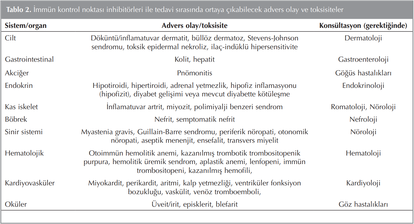 İKNİ ile tedavi sırasında görülebilecek advers olay ve toksisitelere yaklaşım açısından gerekli durumlarda konuya ilişkin algoritmaların yer aldığı kılavuzlara başvurulmalıdır. Brahmer ve arkadaşları İKNİ tedavisi alan hastalarda immün-ilişkili advers olaylar hakkında farkındalığı artırmak ve yönetimi konusunda rehberlik sağlamak amacıyla tıbbi onkoloji, dermatoloji, gastroenteroloji, romatoloji, pulmonoloji, endokrinoloji, üroloji, nöroloji, hematoloji, acil tıp, hemşirelik ve avukatlık konularında uzman kişilerin bir araya gelmesi ile klinik uygulama kılavuzu oluşturmak üzere multidisipliner bir çalışma yapmışlardır (41). Çalışmada, İKNİ ile tedavi sırasında ortaya çıkabilecek advers olay ve toksisitelerin spesifik organ/sistem temelinde tanısı ve yönetimi için öneriler sunulmuştur (41). Yönetim, etkilenen organ sistemine göre değişmekle birlikte, genel olarak grade 1 toksisiteler için (bazı nörolojik, hematolojik ve kardiyak toksisiteler hariç) yakın izleme ile İKNİ tedavisine devam edilmesi önerilmektedir. Grade 2 toksisitelerin çoğunda İKNİ tedavisi askıya alınabilir ve semptomların derecesi düştüğünde devam edilebilir, kortikosteroidler uygulanabilir. Grade 3 toksisiteler, genellikle İKNİ tedavisinin askıya alınmasını ve yüksek doz kortikosteroidlerin başlatılmasını gerektirir. Bazı dirençli olgular infliksimab veya başka bir immünsüpresif tedavi gerektirebilir. Grade 4 toksisitelerde, hormon replasmanı ile kontrol edilen endokrinopatiler hariç, genellikle İKNİ tedavisinin kalıcı olarak kesilmesi önerilir (41). İKNİ tedavisi sırasındaki olası advers olay/toksisiteler özet olarak Tablo 2’de gösterilmiştir. İKNİ ile tedavi edilmekte olan hastalarda özellikle advers olay/toksisite varlığında multidisipliner bir yaklaşımın gerekliliği aşikardır.