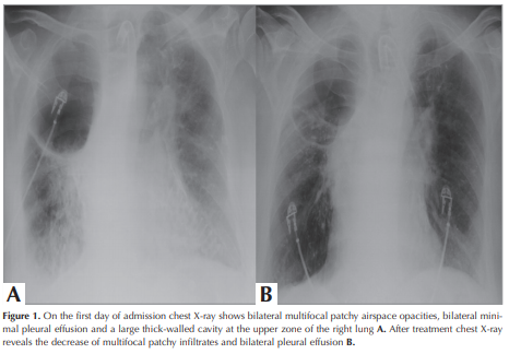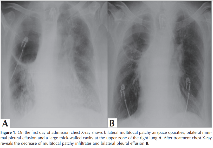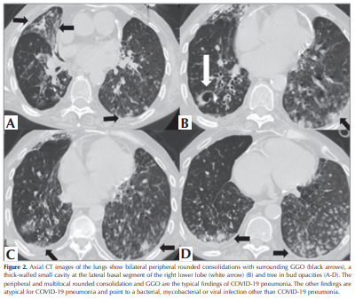 The patient was admitted to the hospital with shortness of breath, fever, and increased tracheal secretions for the last two weeks. The patient had neither traveled outside of Turkey nor had been exposed to anyone with suspected or confirmed diagnosis of COVID-19. Physical examination was remarkable for ronchi bilaterally. Heart sounds were normal. His vital signs included a temperature of 37.8°C, blood pressure of 110/75 mmHg, heart rate of 87/minute, respiratory rate of 21/minute, saturation of 90% on MV with SIMV mode and FiO2 50%. Laboratory results were as follows; white blood cell count (WBC) of 15.02x109/L, a hemoglobin (Hb) level of 11.6 g/dL, a lymphocyte count of 0.21 x109/L, and a platelet count of 203x109/L. A large cavity at upper zone of the right lung and heterogenous opacities at middle and lower zones of the both lungs were seen on chest X-ray (Figure 1 A). Chest CT showed bilateral peripheral multifocal rounded consolidation and ground glass opacities (GGO) and tree in bud opacities with centrilobular nodules. Also there was a cavity at lateral basal segment of the right lower lobe The peripheral and multifocal rounded consolidation and GGO are the typical findings of COVID-19 pneumonia. The other findings are atypical for COVID-19 pneumonia and point to a bacterial, mycobacterial or viral infection other than COVID-19 pneumonia (Figure 2). Parenteral antibiotic treatment was initiated empirically. SARS-CoV-2 RT-PCR analysis of two consecutive combined NP/OP swabs was reported negative. Even though RT-PCR results were negative twice, the patient was considered compatible with COVID-19 pneumonia with radiological and clinical features. Therefore; he was accepted to the intensive care unit (ICU) and isolated. Rapidly; hydroxychloroquine 200 mg b.i.d. and azithromycin 500 mg q.i.d were initiated for probable COVID-19 and piperacillin/tazobactam were started empirically owing to a probable bacterial co-infection. By the tracheostomy cannula, mechanical ventilation was continued. Subcutaneous low molecular weight heparin (LMWH, enoxaparin) 6000 U b.i.d was applied. After two days, he deteriorated clinically. He had subfebrile fever, tachypnea and was hypotensive with need of vasopressors. CRP and procalcitonin levels had increased, so ETA bacterial culture and viral PCR examinations were repeated. Antibiotic regimen was escalated, meropenem treatment was initiated. Pseudomonas aeroginosa ˃105 CFU/mL was cultured on microbiological examination. SARS-CoV-2 RT-PCR analysis of the ETA sample was also found to be positive. After PCR positivity, favipravir 1600 mg was administered orally twice daily on day 1, then 600 mg orally twice daily. Hydroxychloroquine, azithromycin and favipravir therapy was continued for five days. Seven days later, the patient had fever and was worsened clinically, despite suitable antimicrobial treatment for bacterial infection. CRP and procalcitonin levels increased to 250 mg/L and 32 ng/mL, respectively. Bacterial culture and RT-PCR test for SARS-CoV-2 from ETA were repeated. Bacteriological culture revealed the growth of ˃105 CFU/mL Acinetobacter baumannii, while colony count of Pseudomonas aeroginosa was decreased to <104 CFU/ml. So, intravenous colistin 300 mg was administered once daily on day 1, then 150 mg twice daily and intravenous phosphomycine 6 gr was added three times daily. Nearly three days later, the patient’s fever dropped to normal levels, and FiO2 level was reduced to 30%. Under the ongoing antibiotic regimen, the patient’s clinical and radiological findings were stable. On the 27th day, regression of lesions was observed on chest X-ray (Figure 1 B).