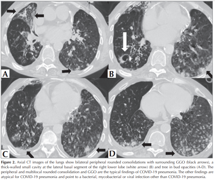 RT-PCR analysis of viral RNA is regarded as the reference standard test in COVID-19 diagnosis; although, research have showed the prominence of chest CT in patients with false negative RT-PCR results and reported the CT sensitivity as 98% (10). Bilateral round-shaped ground glass opacities with or without consolidation at posterior and peripheral lungs were the most important diagnostic findings of COVID-19 at chest CT (10). Presence of centrilobular nodules, tree in bud appearance and cavity suggest a bacterial, mycobacterial and viral infection other than COVID-19 pneumonia or superinfection as we have seen in our patient (11).