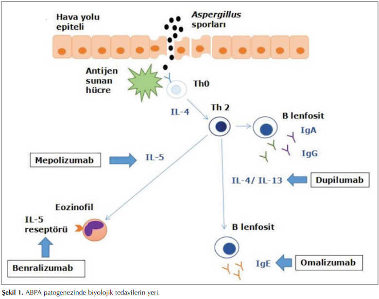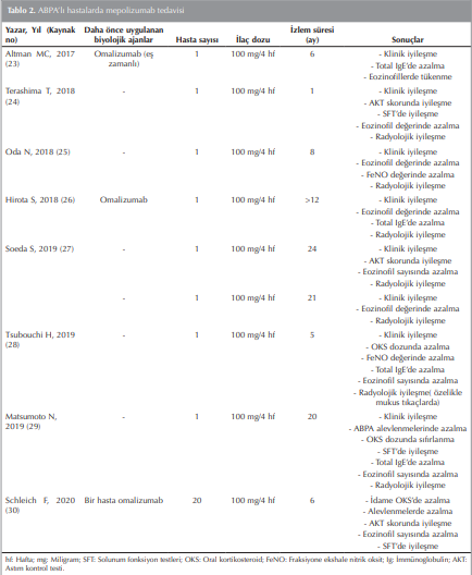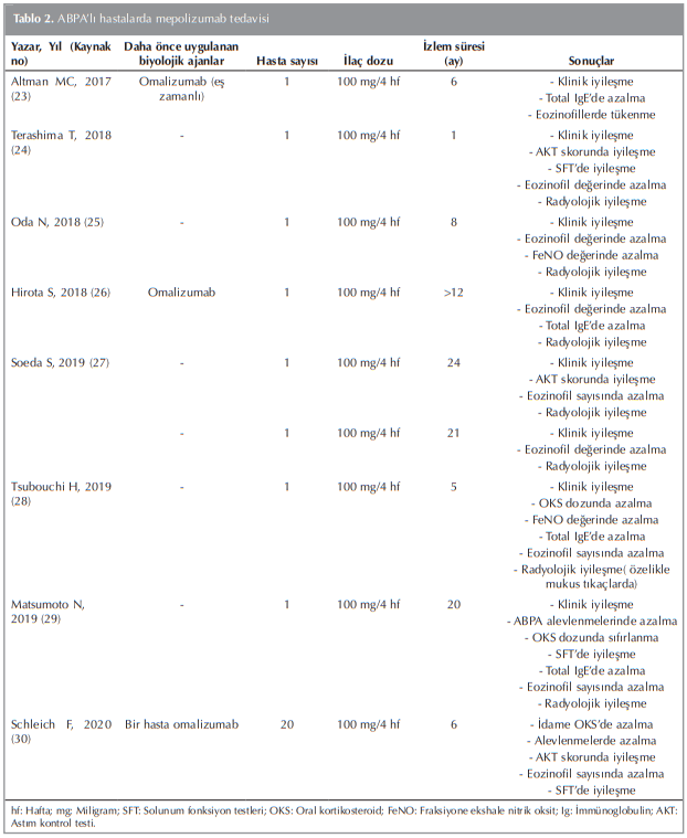 Alerjik Bronkopulmoner Aspergillozis patogenezinde yer alan eozinofilleri hedefleyen mepolizumabın 4 haftada bir 100 mg subkutan olarak başarıyla uygulandığı olgular literatürde yer almaktadır Tablo 2.