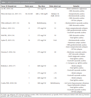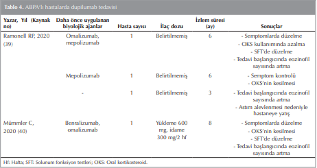 Dupilumab, hem IL-4 hem de IL-13 uyarısıni inhibe eden IL-4 reseptör alfa alt birimine karşı geliştirilmiş bir humanize MoAb’tır. Th2 inflamasyonun aracılık ettiği ağır astım, atopik dermatit ve nazal polip gibi hastalıkların tedavisinde kullanılmaktadır. Dupilumab tedavisi ile astımlı hastalarda solunum fonksiyonları iyileşmekte; alevlenmeler, Tip 2 inflamasyon biyobelirteçleri ve OKS dozları azalmaktadır ((37),(38)). Patogenezde yer alan hem IL-4 hem de IL-13 sitokinlerinin etkisini engelleyen dupilumab tedavisinin, ABPA’lı hastalarda uygulandığı az sayıda olgu sunusu bulunmaktadır (Tablo 4).