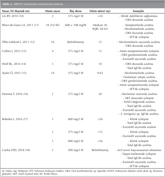 Alerjik Bronkopulmoner Aspergillozisli hastalarda da Tip 1 aşırı duyarlılık patogenezin önemli bir parçasıdır ve Aspergillus’a karşı aşırı IgE yapımı ile total IgE yüksekliği vardır. Bu nedenle de omalizumab etkili bir tedavi seçeneği olabilir. ABPA tanılı astımlı hastalarda literatürde İngilizce tam metnine ulaşılabilen ilk olgu raporu 2010’da yayınlanmıştır ve bunu daha sonraki yıllarda yapılan çalışmalar izlemiştir Tablo 1.
