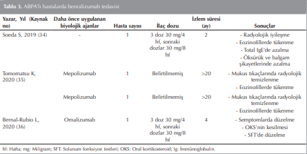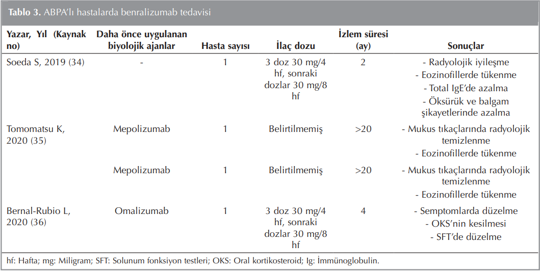 Komorbid durumları nedeniyle OKS alamayan, radyolojik görüntülerde mukus tıkaçları olan ABPA’lı iki erişkin hasta bildirilmiştir. Bu iki hastaya mepolizumab uygulanmış; hastaların solunum semptomlarında ve solunum fonksiyonlarında iyileşme ile birlikte periferik kan eozinofil sayısında azalma gözlemlenmiş ancak mukus tıkaçları görüntülemelerde devam etmiştir. Bunun üzerine hastaların mepolizumab tedavisi benralizumab ile değiştirilmiştir. Benralizumab tedavisi sonrası kontrollerinde bilgisayarlı tomografi mukus tıkaçları temizlenmiş ve hastaların periferik eozinofil değerleri sıfırlanmıştır (35). Bu iki hastada mukus tıkaçların tamamen temizlenmesinde ve periferik eozinofil sıfırlanmasında benralizumabın mepolizumabdan daha etkin olduğunu göstermektedir. Benralizumab antikor bağımlı hücre aracılı sitotoksisite ile hava yollarında mevcut olan eozinofilleri de ortadan kaldırabilir. Bu sayede mepolizumaba ek fayda sağlayabilir (32).