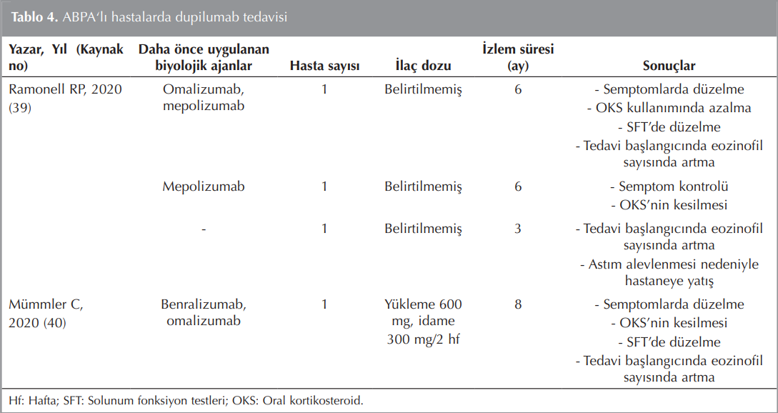 Benralizumab ve omalizumabdan fayda görmeyen ABPA tanılı bir hastanın tedavisi dupilumab ile değiştirilmiş ve dupilumab sonrası hastanın semptomları düzelmiş, AKT puanı yükselmiş ve OKS dozu azalmış. Ayrıca tedavi ile FEV1, total IgE ve FeNO düşmüş, ancak tedavinin başlangıç döneminde eozinofil değerleri yükselmiş (40). Sonuç olarak ABPA tanılı az sayıda hastaya dupilumab uygulanmış ve hastalar fayda görmüştür. Ancak dupilumab tedavisinin erken döneminde eozinofil sayısının artabileceği akılda tutulmalıdır.